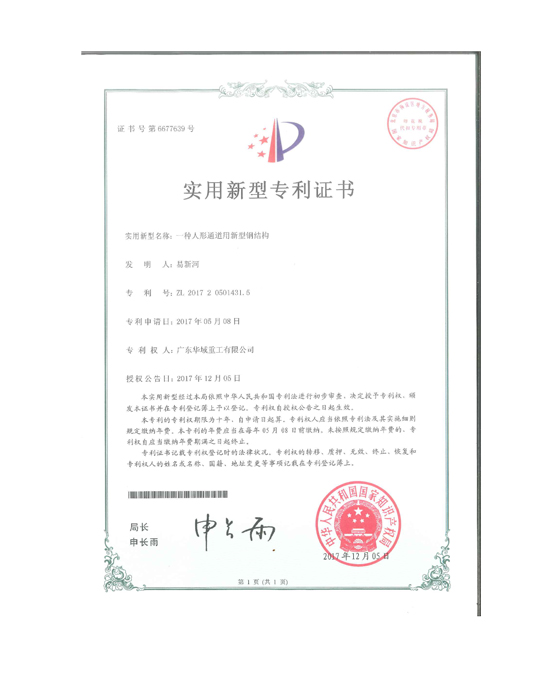 實(shí)用新型一種人行通道用新型鋼結(jié)構(gòu)2017專利證書