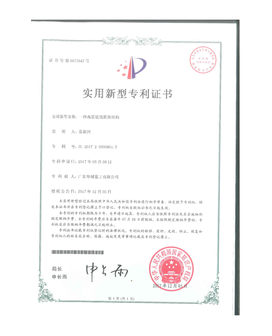 實(shí)用新型一種高層建筑高層結(jié)構(gòu)2017專利證書