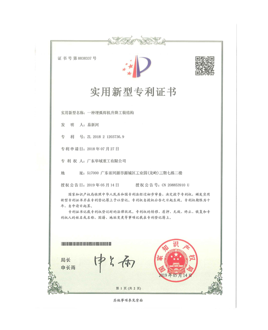 埋弧焊機(jī)升降工裝結(jié)構(gòu)專利證書